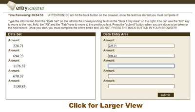 EntryScreeners Ten Key Speed Test can be fully customized with any combination of numbers (decimals, negative/positive numbers, addresses, phone numbers, etc.) or you can upload company specific content to create your assessment.